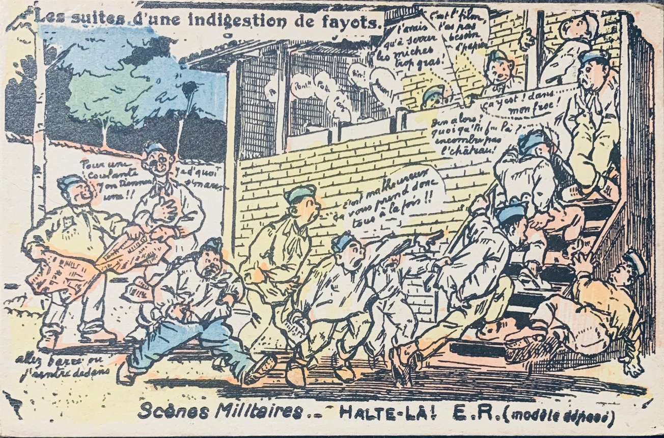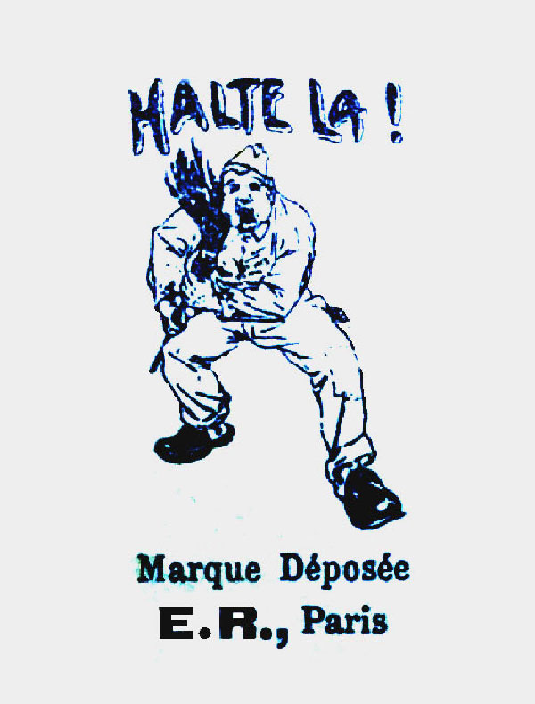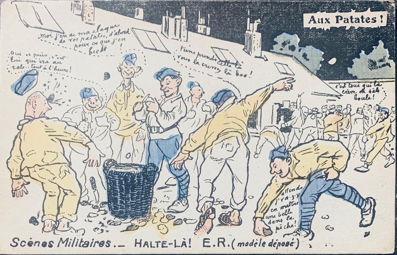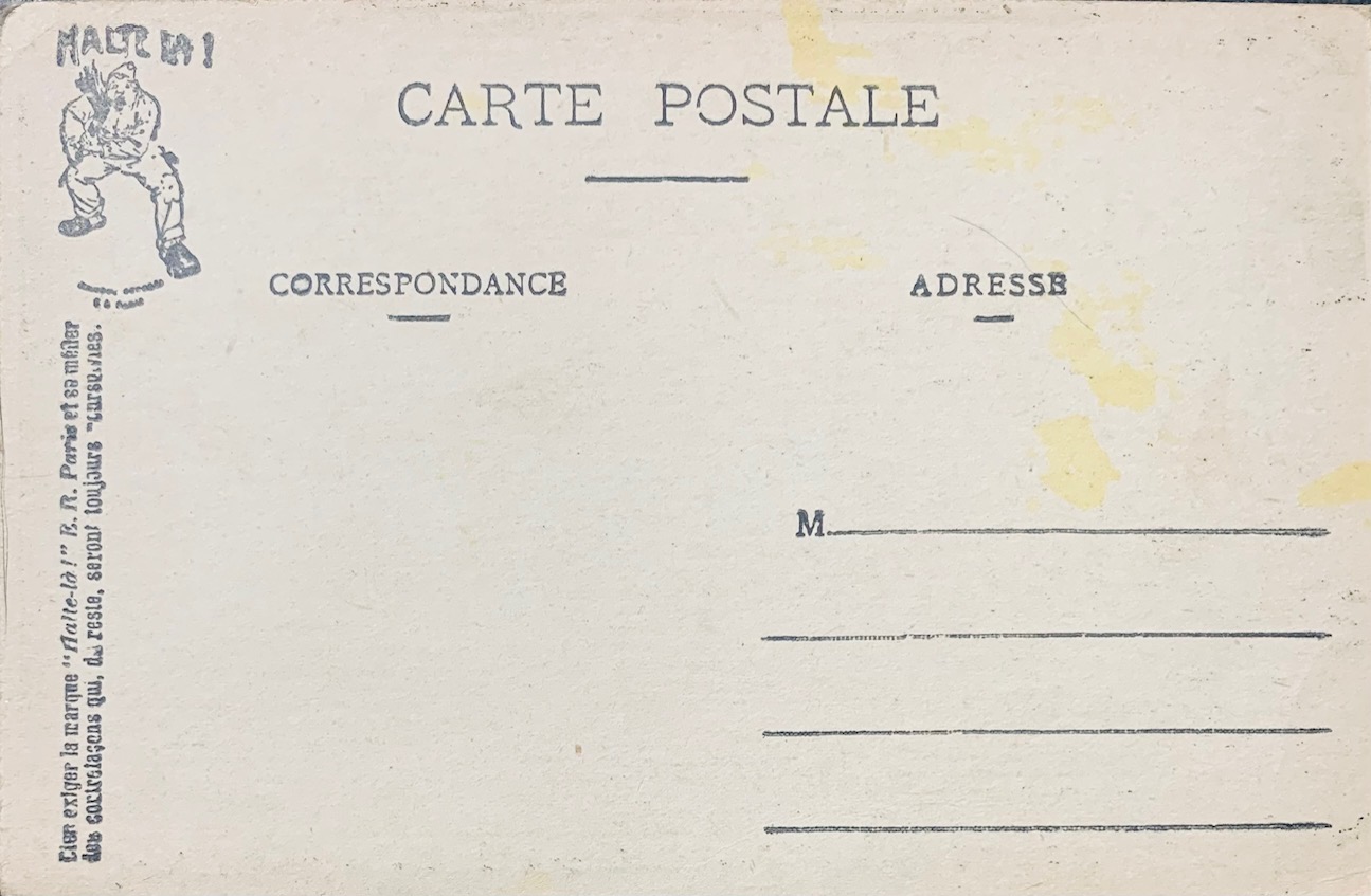 La marque 'Halte-là !' de l'éditeur E. Reynaud (ER-PARIS) est une icône de la Grande Guerre. Elle se distingue par des zones au recto on l'on pouvait écrire nombres de jours restant par exemple ainsi que son logo de sentinelle au verso et son humour piquant sur la vie de caserne. Petite curiosité : sur certaines éditions comme 'L'Échelle de la Classe', on peut observer des fautes de frappe d'époque ('Interdirte'), témoins d'une production intensive en temps de guerre. L'humour de ces cartes servait d'exutoire face aux corvées répétitives (comme l'épluchage des patates) ou aux situations inconfortables, créant un lien de complicité entre les soldats et leurs familles.