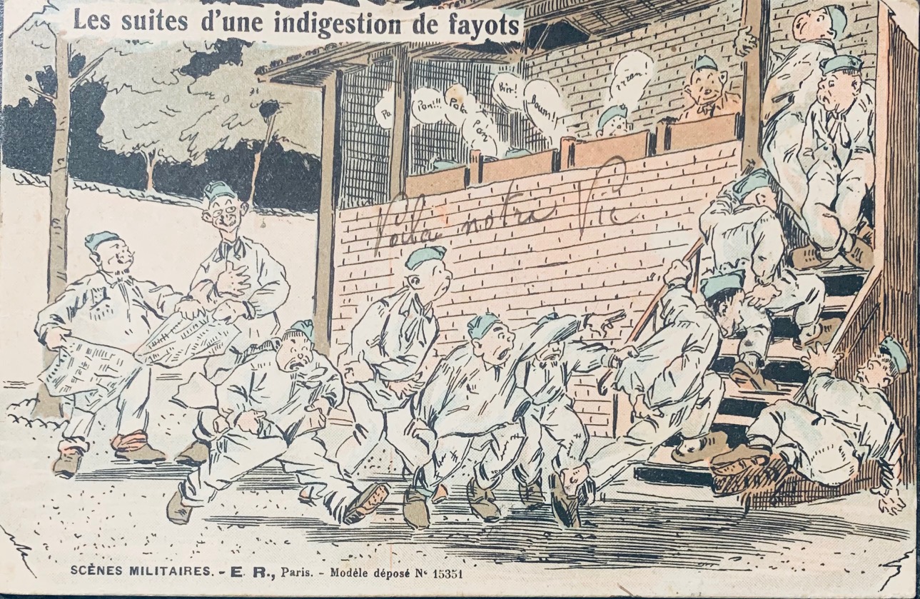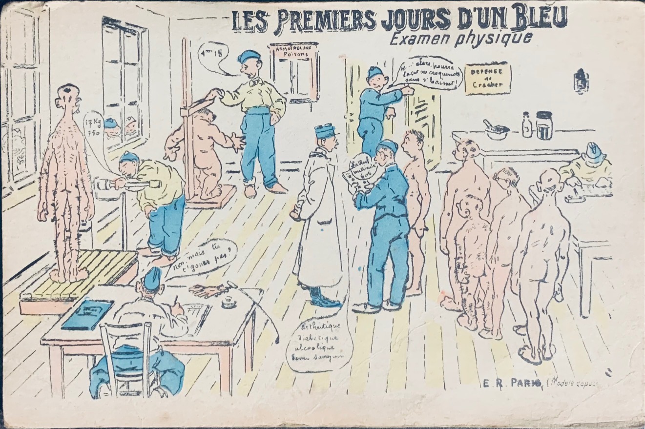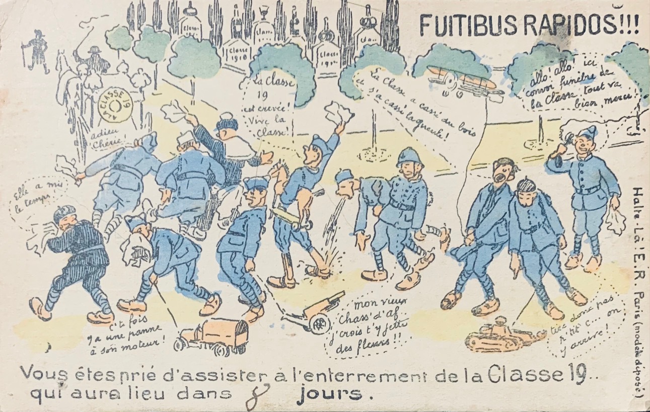La marque 'Halte-là !' de l'éditeur E. Reynaud (ER-PARIS) est une icône de la Grande Guerre. Elle se distingue par des zones au recto on l'on pouvait écrire nombres de jours restant par exemple ainsi que son logo de sentinelle au verso et son humour piquant sur la vie de caserne. Petite curiosité : sur certaines éditions comme 'L'Échelle de la Classe', on peut observer des fautes de frappe d'époque ('Interdirte'), témoins d'une production intensive en temps de guerre. L'humour de ces cartes servait d'exutoire face aux corvées répétitives (comme l'épluchage des patates) ou aux situations inconfortables, créant un lien de complicité entre les soldats et leurs familles.