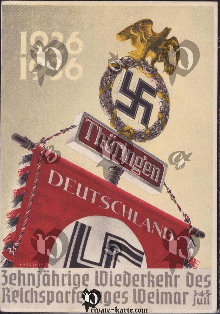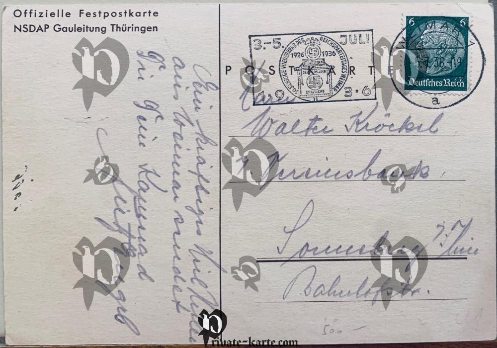CPA Weimar 1926-1936 pour le 10e anniversaire du congrés du parti du Reich de Weimar, Carte postale officielle NSDAP Gauleitung avec tampon banniére Thüringen 3-5 Juillet 1936 timbre Paul von Hindenburg Deutsches Reich.