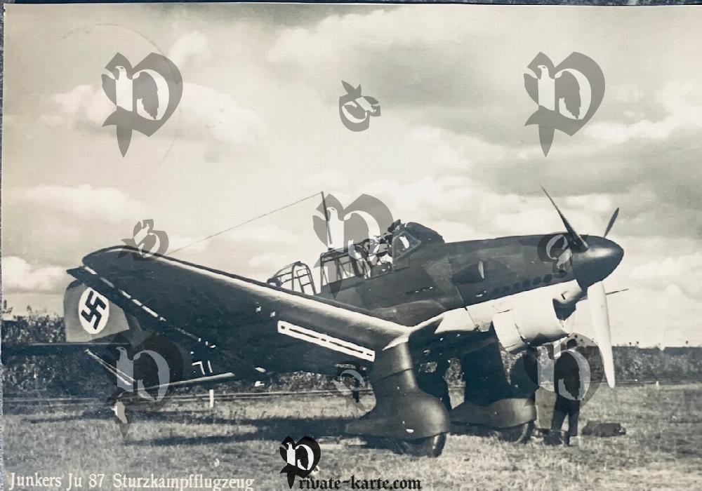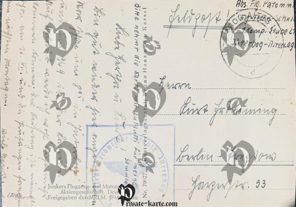 Carte postale d'une photo du célébre avion de chasse Allemand le JUNKERS JU87 tamponné Feldpost poste militaire du célébre aérodrome Juterbog 1942. Les bords blancs ont l'air d'avoir été coupés.