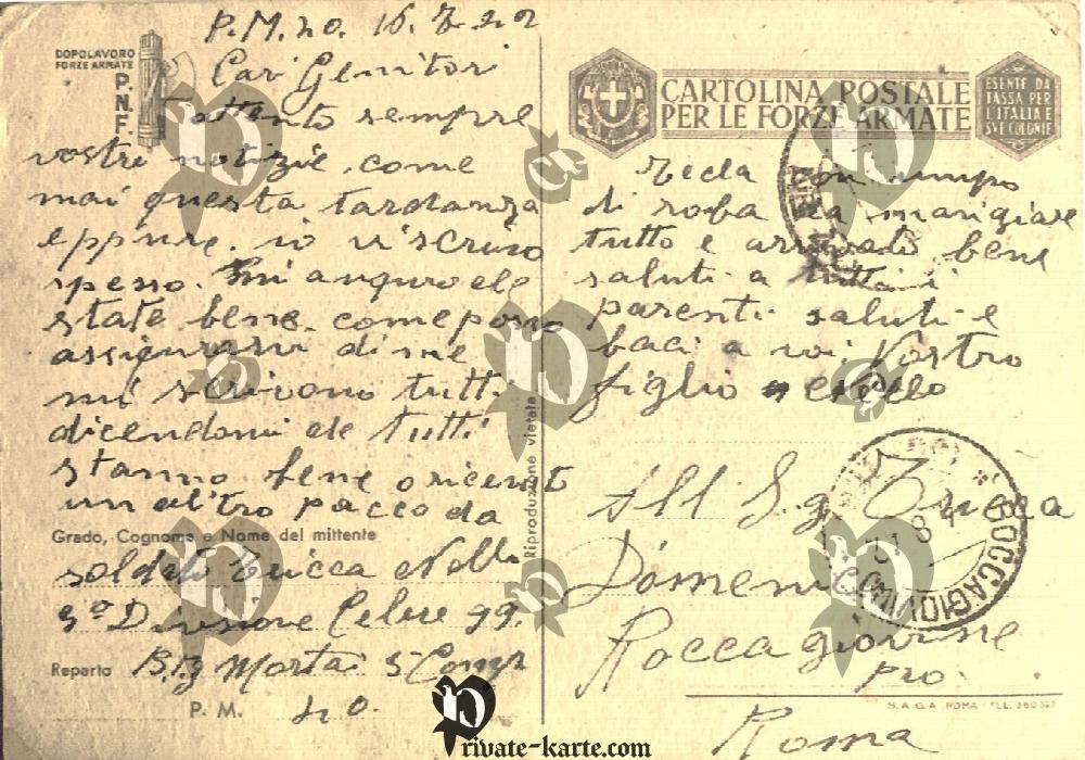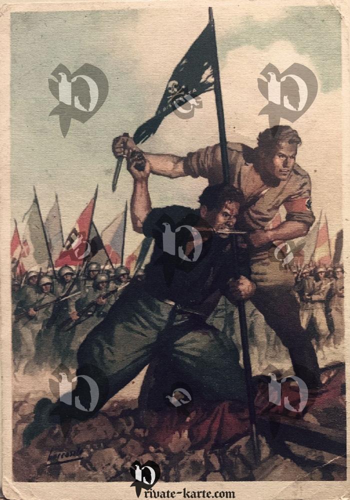 Carte postale de propagande Italienne avec en dessin un champ de bataille montrant l'entraide entre Italien, Allemand, Japonais en gros l'axe de la victoire et tous leurs drapeaux on voit même des Japonais, jolie carte même si un peu abimé avec le temps à avoir dans sa collection. Carte postale qui a voyagé en poste militaire Italienne.
