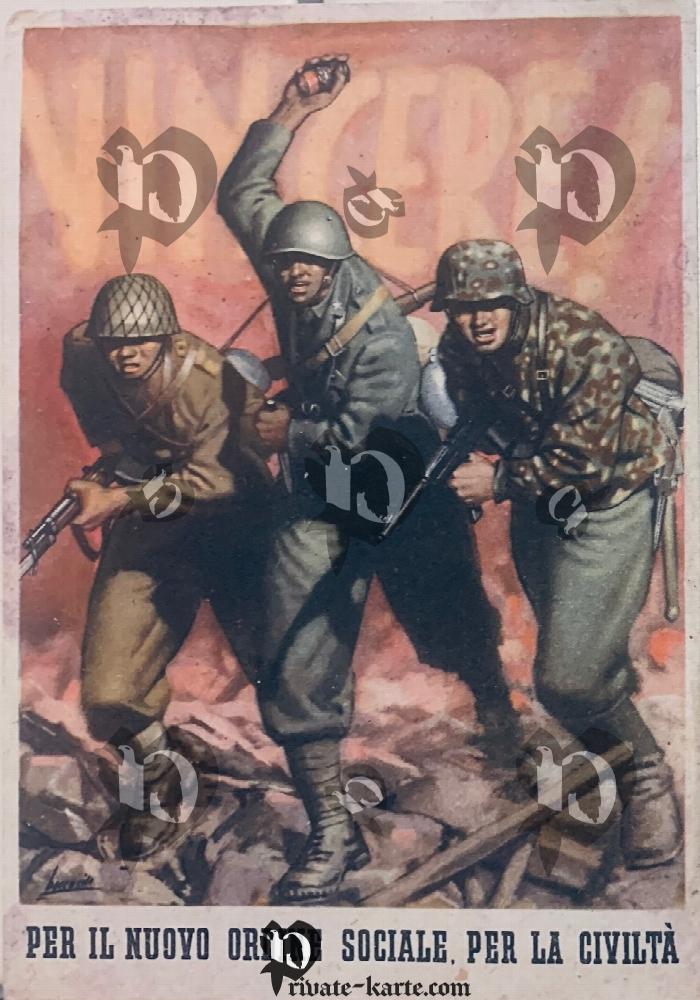 Carte postale soldat Waffen SS, Itlaien et japonais en avant avec inscription « Pour le nouvel ordre social pour la civilisation » Magnifique et rare carte postale un peu de tache à cause du vieillissement de la carte.